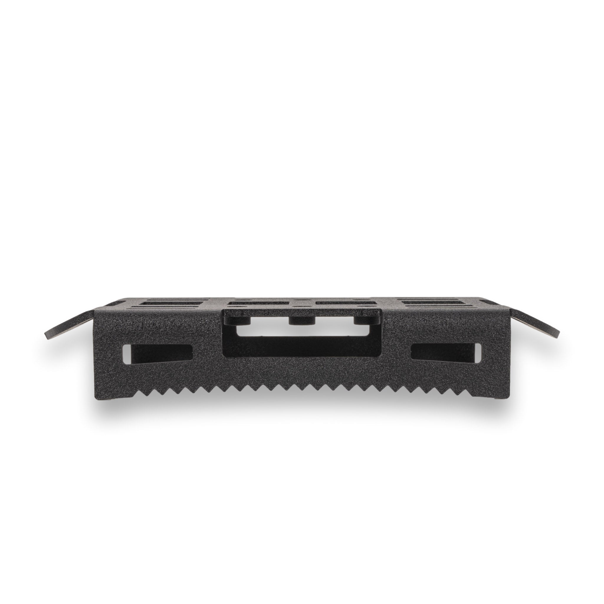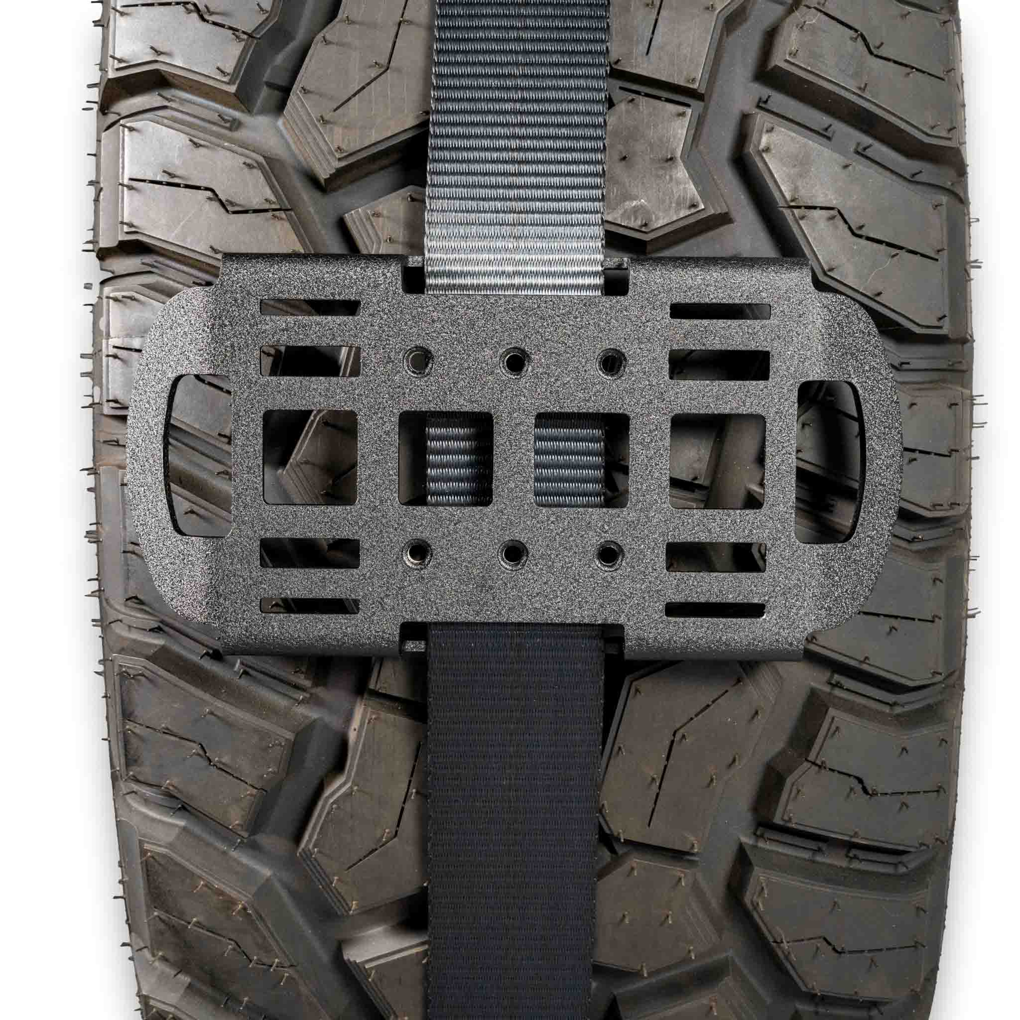 Each block features slotted passthroughs for a 2″ web strap from a heavy-duty ratchet strap (not included). Once tightened, the aggressive teeth along the bottom edge bite into the tire, preventing slippage or rotation during heavy trail impacts or extended washboard sections.