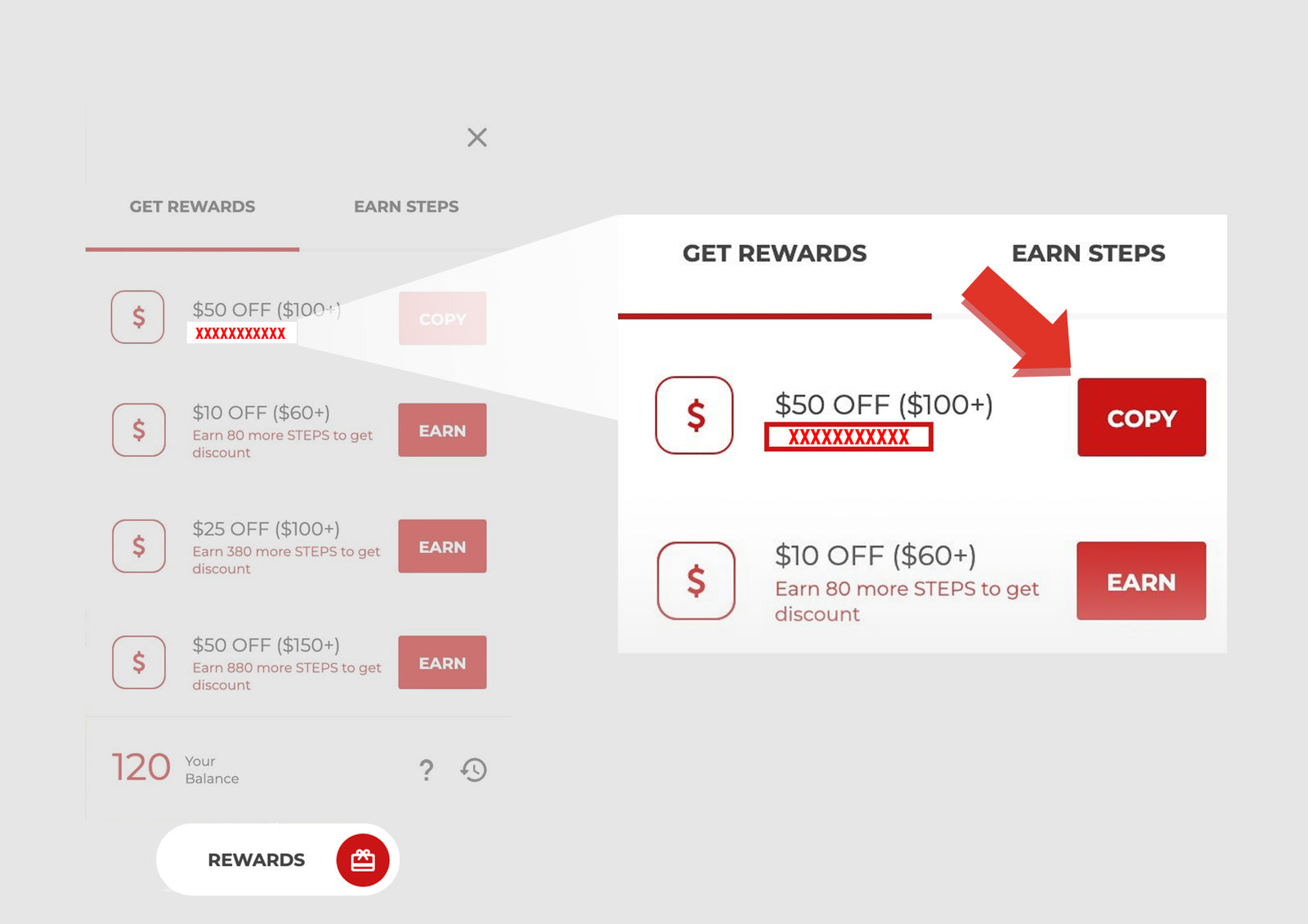 STEPS add up to serious discounts. Earn $10, $25, $50, or $100 off once you collect enough reward STEPS.